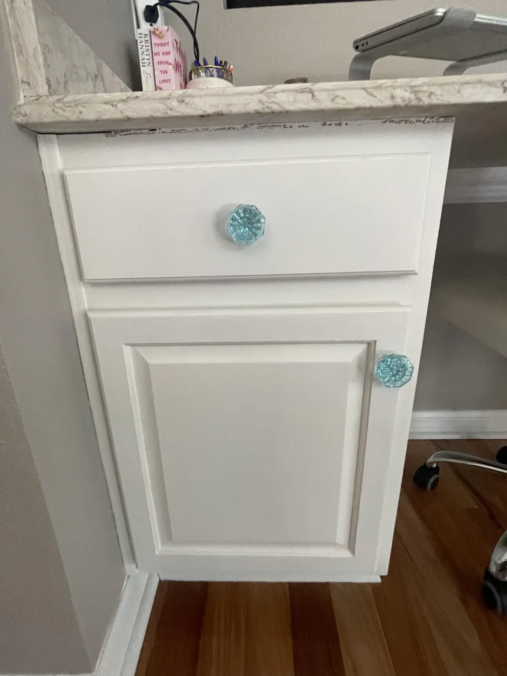 Beautiful Glass Moon Drop Knobs. Each uniquely special and different. Vintage like feel, circle bubble accents. These beautiful glass knobs are sure to make your heart happy! The perfect finishing touch for your bathroom, kitchen or master bedroom renovation! Handmade.