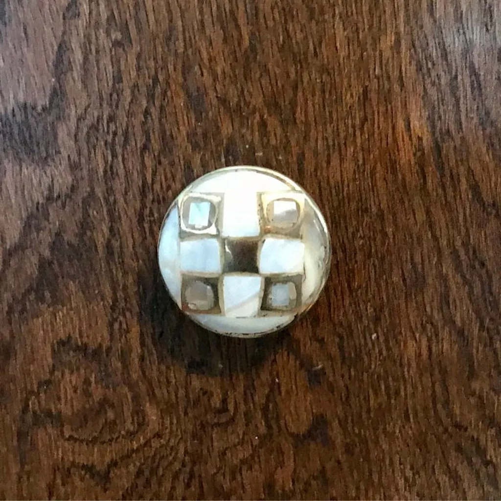 Mother of Pearl Checkerboard Knob, made with brass, gold metal, and mother of pearl seashell. These gorgeous pearlescent handmade knobs are both elegant and chic. The perfect drawer pull that brings you back to vacation over and over again.