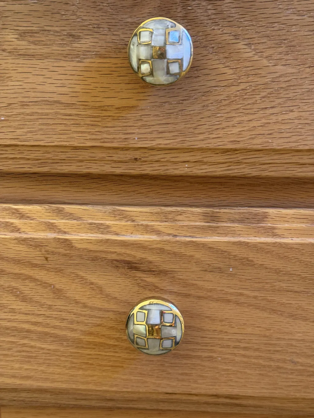 I love these new knobs. The brass brings out the glow in our natural red oak bathroom vanity. They have a nice feel and are easy to grasp. The mother of pearl accent gives a smooth, clean look to the cabinetry. Thanks for the fast shipping and careful packaging.